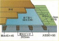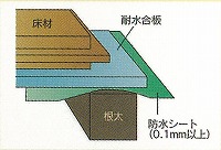 - 必ず0.1mm厚以上の防水シートを根太と捨て貼り合板の間に敷き込んで下さい。